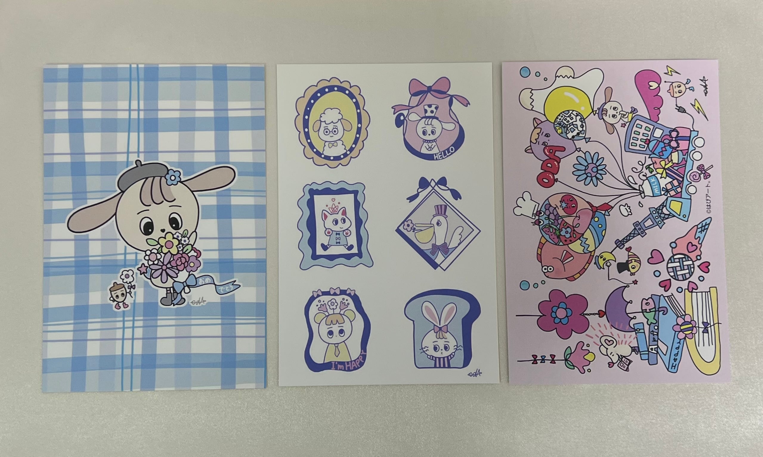 左から、おめでとう!、わたしたち美術館、webサイトのホームページ、をテーマにデザインしました!